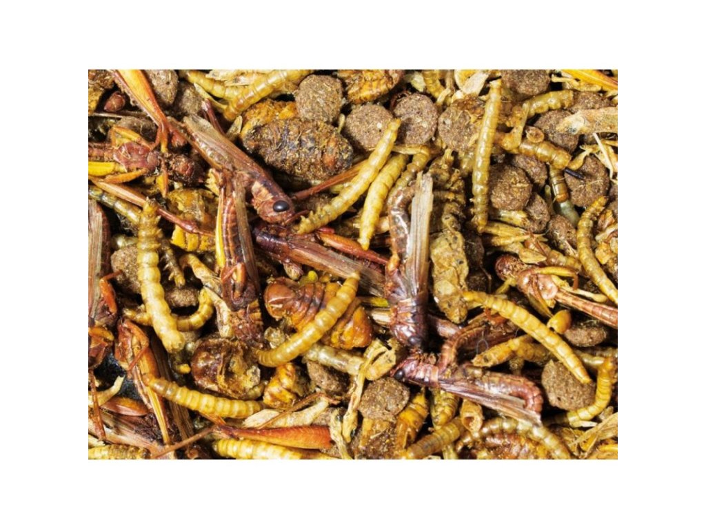 - Složení: extrudovaná pšeničná mouka, mouční červi, kokony bource morušového, drůbeží protein, kobylky 10%, krevety 10%, extrudovaná kukuřičná mouka, hovězí tuk, drůbeží tuk