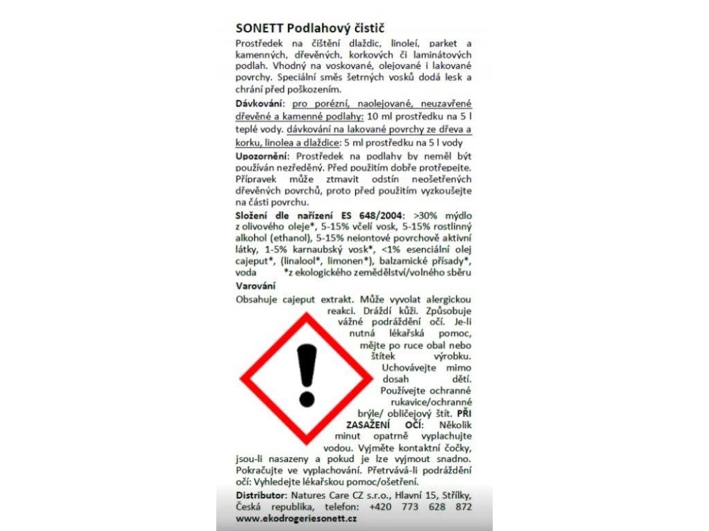 Upozornění: Prostředek na podlahy by neměl být používán nezředěný. Před použitím dobře protřepejte. Přípravek může ztmavit odstín neošetřených dřevěných povrchů, proto před použitím vyzkoušejte na části povrchu.