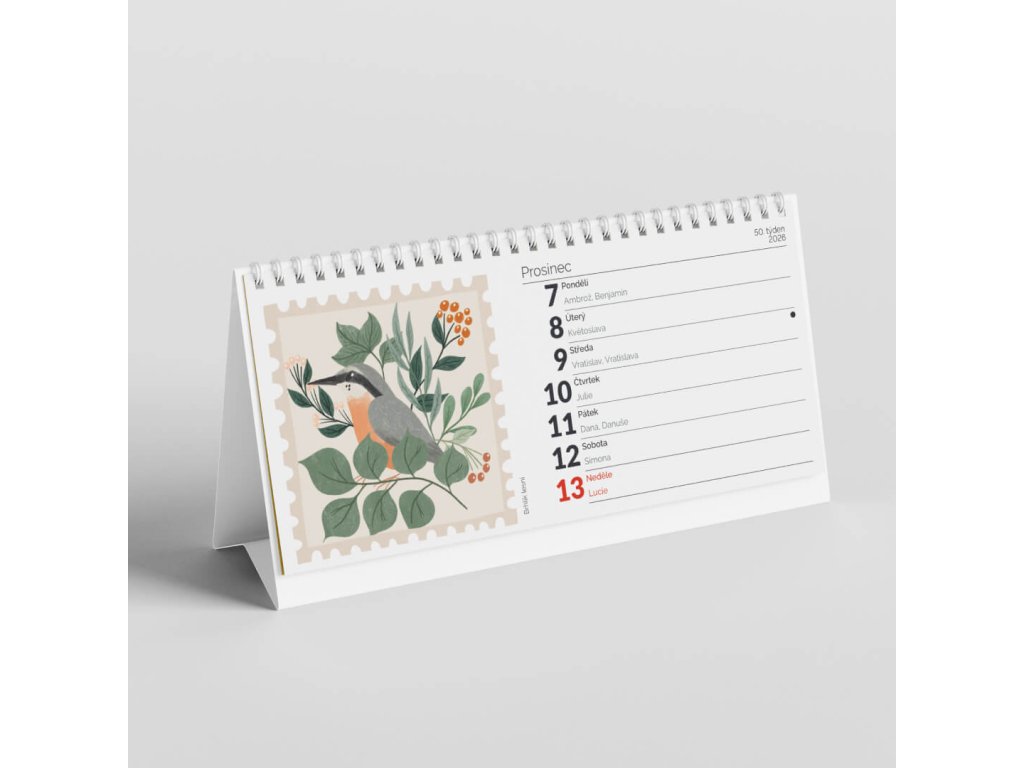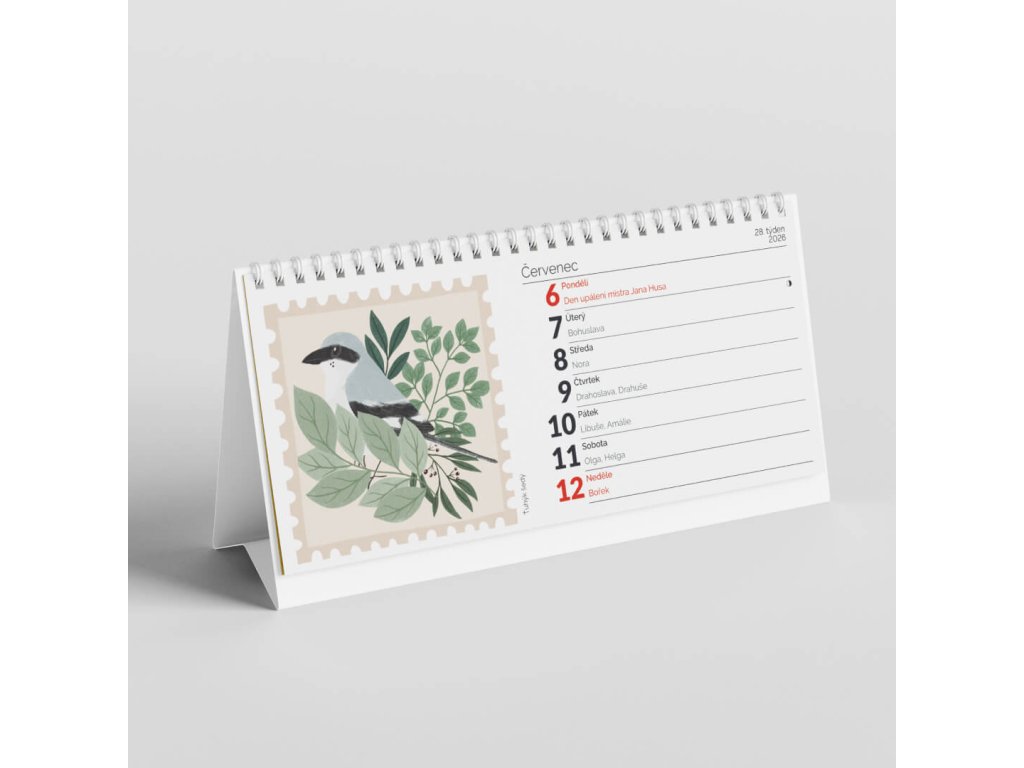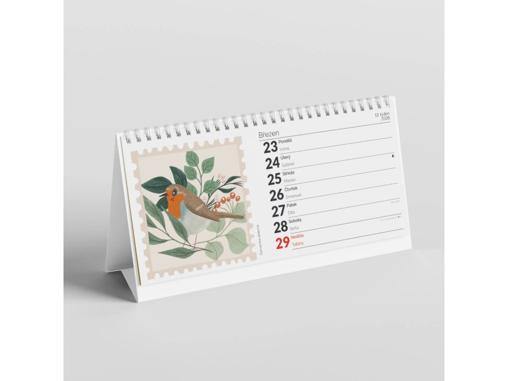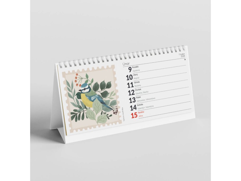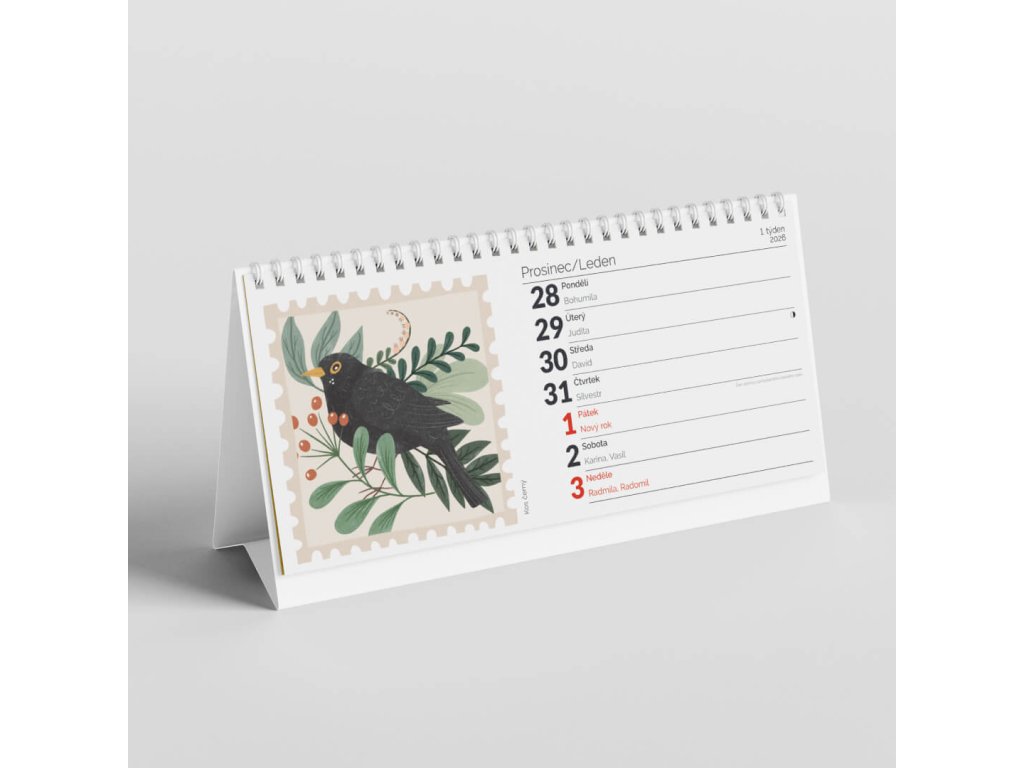 Každý týden je s jiným ptáčkem, s dlouhými řádky u dní, vyznačenými svátky a také fázemi měsíce. Ostatní, co v něm bude psané, je na vás.