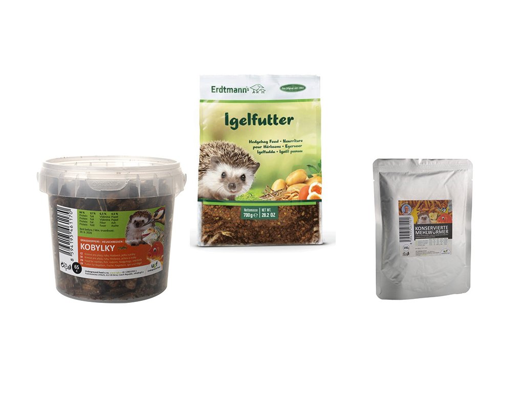 - obsahuje jedno balení krmení pro ježky Erdtmanns, konzervovaného moučného červa a sušených kobylek
