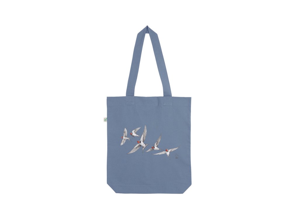 Bavlněná taška s originálním motivem vlaštovek. Taška je vyrobena ze 100% bio bavlny a splňuje mezinárodní standard GOTS*. Rozměry 36x38 cm. Gramáž 170 g/m2.