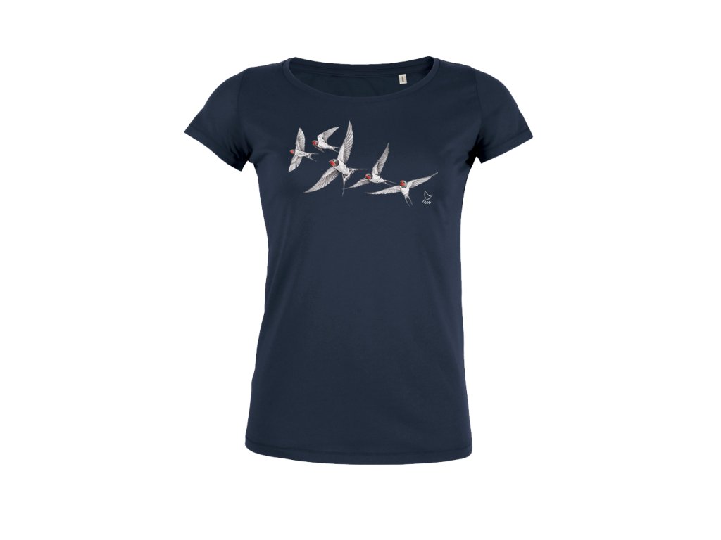 Dámské tričko s originálním motivem letících vlaštovek. Tričko je vyrobeno ze 100% bio bavlny a splňuje mezinárodní standard GOTS*. Gramáž 155 g/m2, technika tisku: digitální potisk.