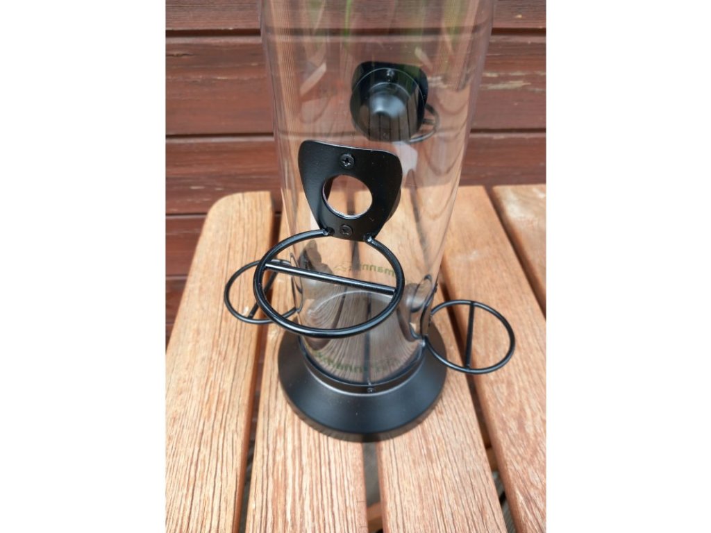 Krmítko je vyrobené z kovu a kvalitního UV odolného plastu (polykarbonát). Víčko se snadno odklopí (ale neztratí se, protože je spojené s krmítkem), takže se krmítko snadno doplňuje. Je vhodné například na slunečnicová semínka, která mají ptáci nejraději. S otvory a kruhovými bidýlky. Otvory jsou konstruované tak, aby semínka byla snadno přístupná, ale nevypadávala ven. Konstrukce krmítka zamezuje chození ptáků v semínkách, což také eliminuje nakažení ptáků různými chorobami, například salmonelou, při kontaktu semínek s ptačím trusem.