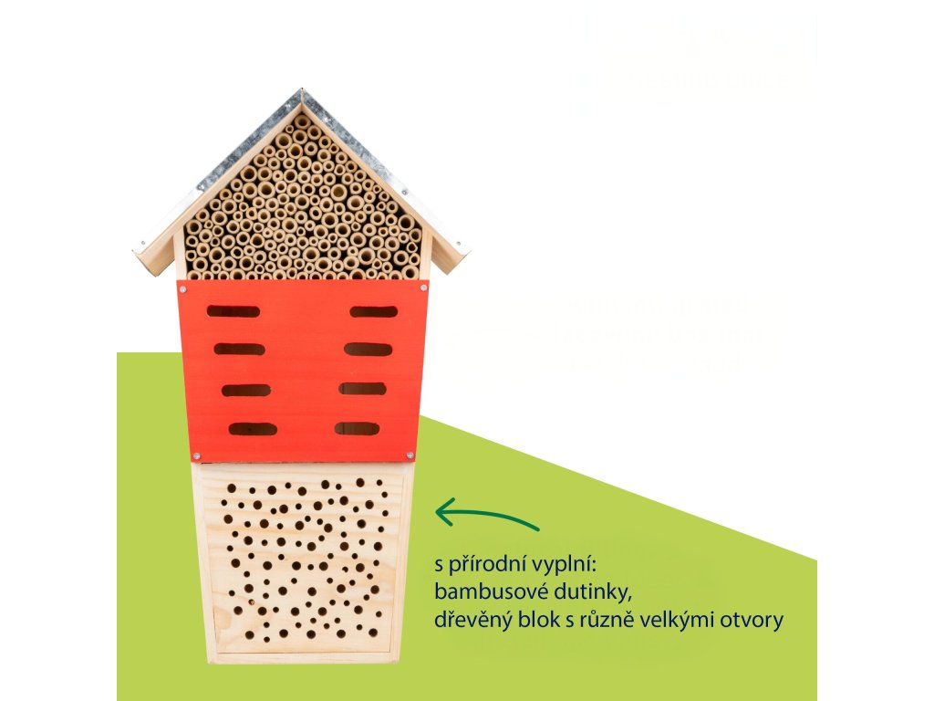- Výplň obsahuje bambusové trubičky a dřevěný blok s vyvrtanými otvory, které poskytují ideální hnízdní prostředí pro různé druhy hmyzu